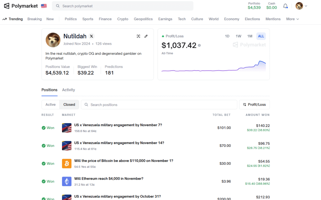 I didn’t plan this. I rejoined Polymarket just a few days back. I came back to check markets, not to turn it into a job. In four days I pushed my profit past $1,000. No hype. No smoke. Just pattern reading and grit.