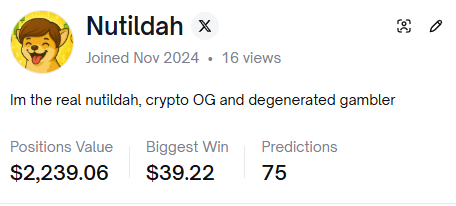 If you want to follow, go ahead. My profile’s public: polymarket.com/@Nutildah. Address 0x413d1FF09fA67C08d9bF295eA4804a26Cc02d704.